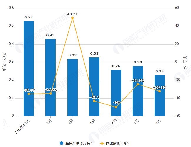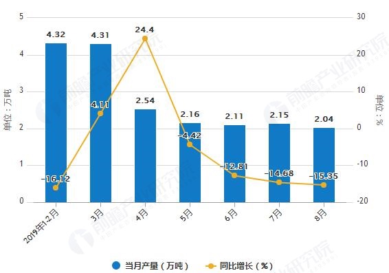 據(jù)國家統(tǒng)計(jì)局統(tǒng)計(jì)數(shù)據(jù)顯示,2019年1-2季度湖南省化學(xué)農(nóng)藥原藥產(chǎn)量波動幅度不大,2019年7月湖南省化學(xué)農(nóng)藥原藥產(chǎn)量為0.28萬噸,同比下降24.32%。2019年1-8月湖南省化學(xué)農(nóng)藥原藥產(chǎn)量為2.49萬噸,...
