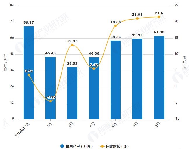 據(jù)國家統(tǒng)計(jì)局統(tǒng)計(jì)數(shù)據(jù)顯示,2019年1-2季度湖南省合成洗滌劑產(chǎn)量有所下降,2019年7月湖南省合成洗滌劑產(chǎn)量為2.15萬噸,同比下降14.68%。2019年1-8月湖南省合成洗滌劑產(chǎn)量為19.75萬噸,同比下降1...
