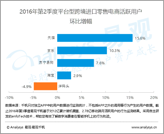 平臺型跨境進口零售電商中,承載其業務APP的活躍用戶表現出了一定的差異:天貓和京東相對較高,分別為15.6%與10.3%;淘寶的活躍用戶增長較低,只有2.9%;蘇寧易購介于二者之間,為7.6%;而洋碼頭則出現了負增長,為-4.9%。這表現出了用戶的選擇偏好有朝B2C模式的平臺型電商集中的趨勢。